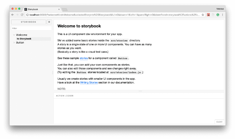 Outra coisa que podemos ver no arquivo de exemplo, é o uso da função action e linkTo. A funcão action é utilizada para criar funções mocks que podem ser passadas como callbacks através das props. Quando os mocks são executados, eles geram um log que aparece no storybook, o que é útil para debugging. A função linkTo por sua vez, cria links para outras stories.