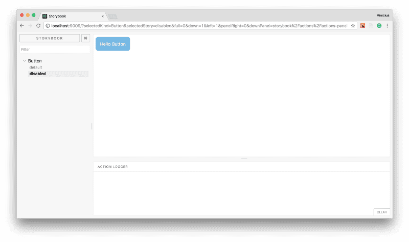 No arquivo acima, nós importamos o componente Button e criamos duas stories para o mesmo. Cada story possui uma utilização básica do componente. A primeira story nós só passamos um callback para a prop onClick, e sendo assim, o button assumirá seu estado padrão. Na segunda story, além da prop onClick, nós passamos a prop disabled, para que nessa story o componente assuma o respectivo estado.