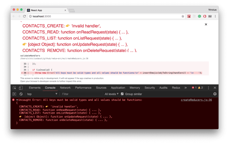As you can see, there’s no magic in the code, all we are doing is verifying if there’s a handler to the given action. If we do, we just call it providing the state and the action, if we don’t, we just return the previous state. The difference is that you have this abstracted and tested for you, with validation as a bonus, to reduce your debugging time in case you provide an invalid action type or an invalid handler: